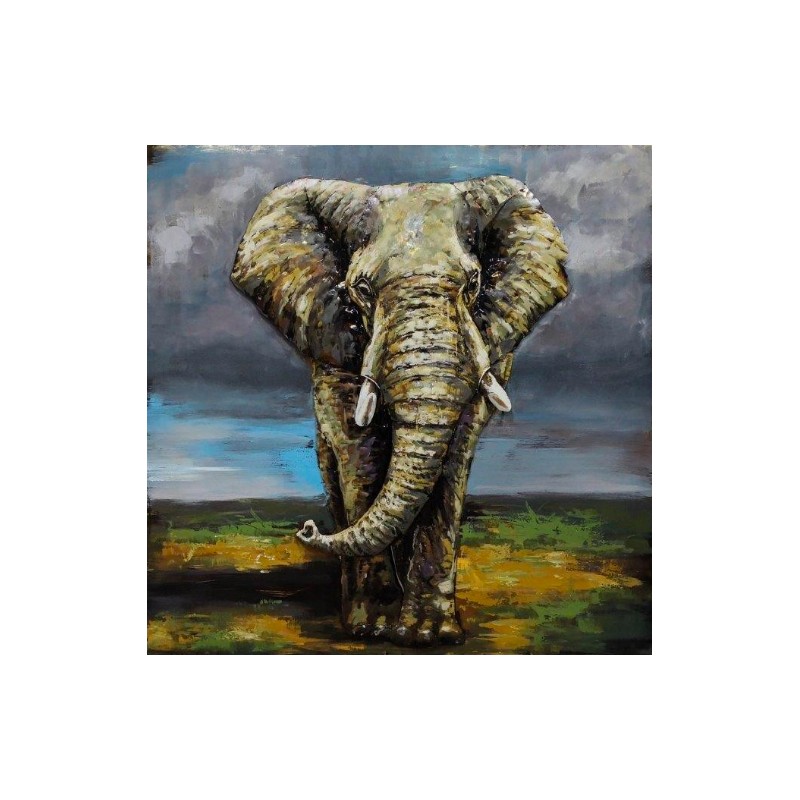 Tableau métal , peinture réalisée à la main effet relief. Représentation d'une magnifique solitaire. Chez les éléphants, la plus vieille femelle guide le troupeau sur des centaines de kilometres, d'un point d'eau à un autre