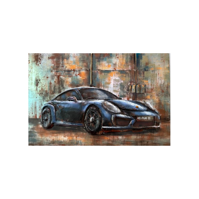 Tableau métal style industriel, peinture réalisée à la main avec effet relief. Représentation d'une Porsche très sportive dans sa ligne