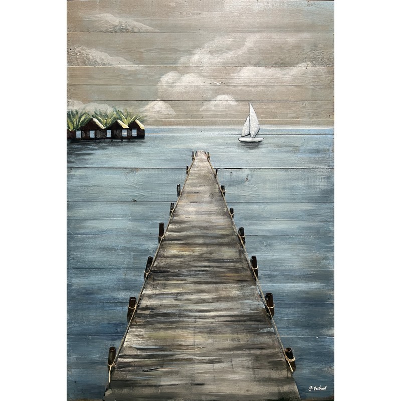 Tableau métal Ponton et vue sur lac 80x120 FOND BOIS EN RELIEF