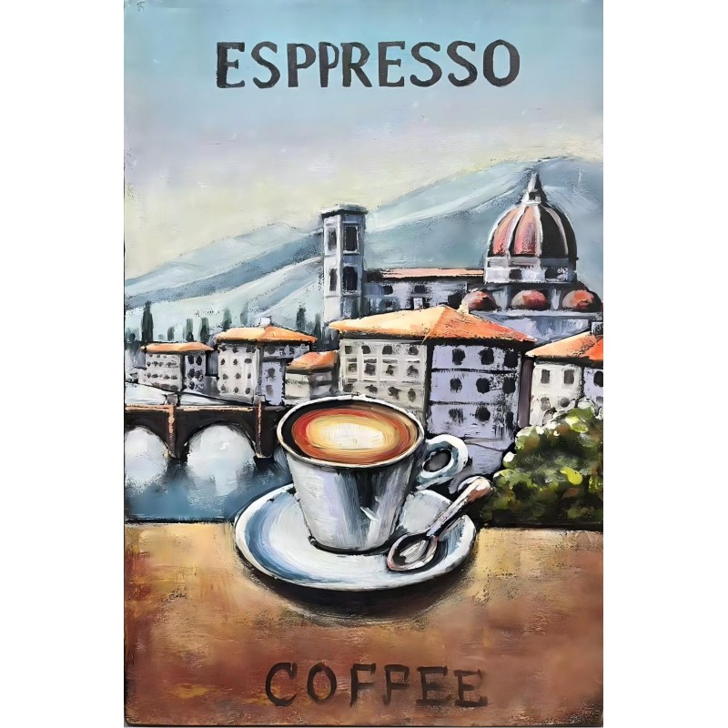 Représentation d'un petit café prêt à être dégusté, avec en arrière plan, un paysage urbain italien.