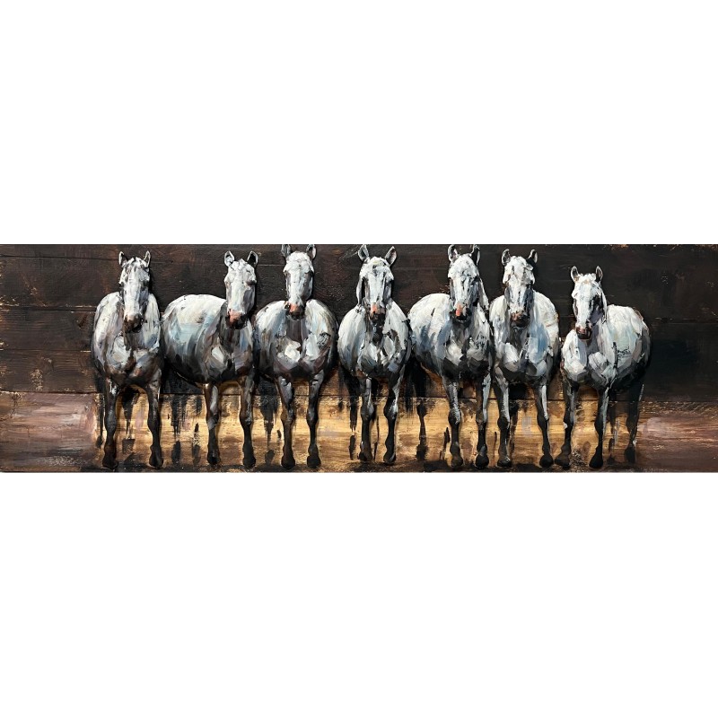 Tableau métal, peinture réalisée à la main avec effet relief. Représentation d'un troupeau de chevaux de camargue